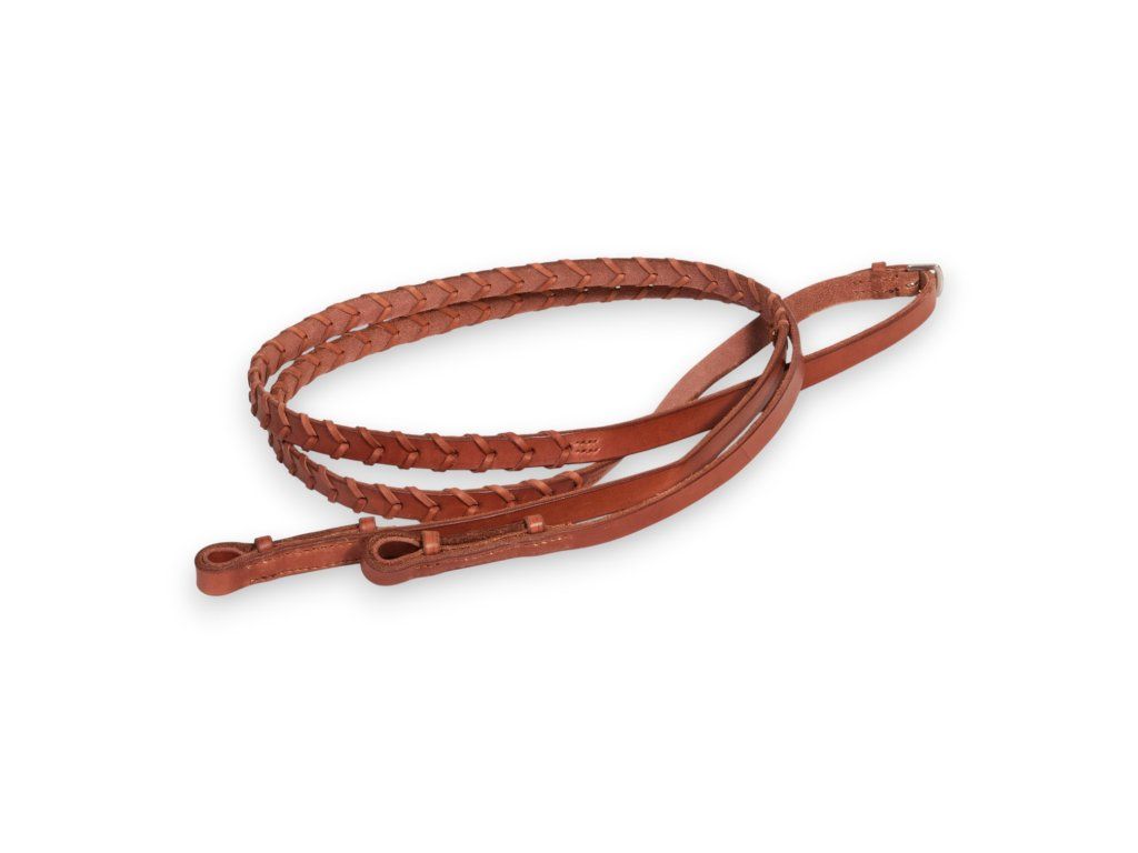 Kožené oplétané otěže pro anglické ježdění a disciplíny jako hunter in hand. Oproti hladkým otěžím nabízejí jistější úchop v ruce. Vyrobené z třísločiněné hovězí kůže, s nerezovým kováním a výběrem z více barev a délek.
