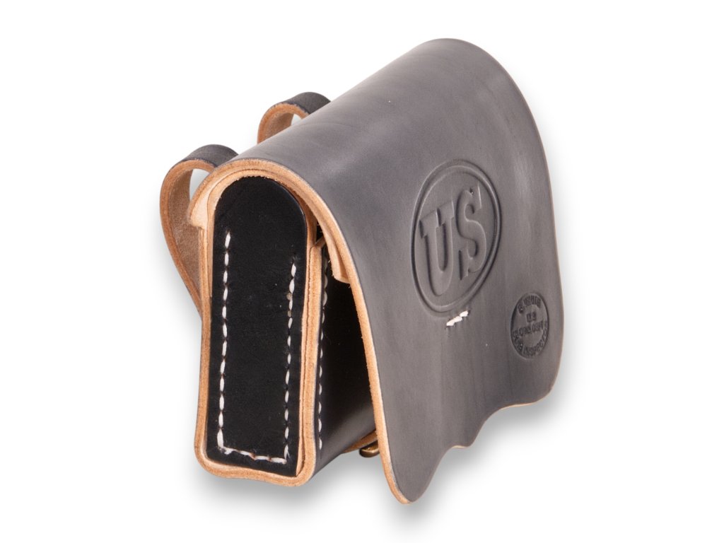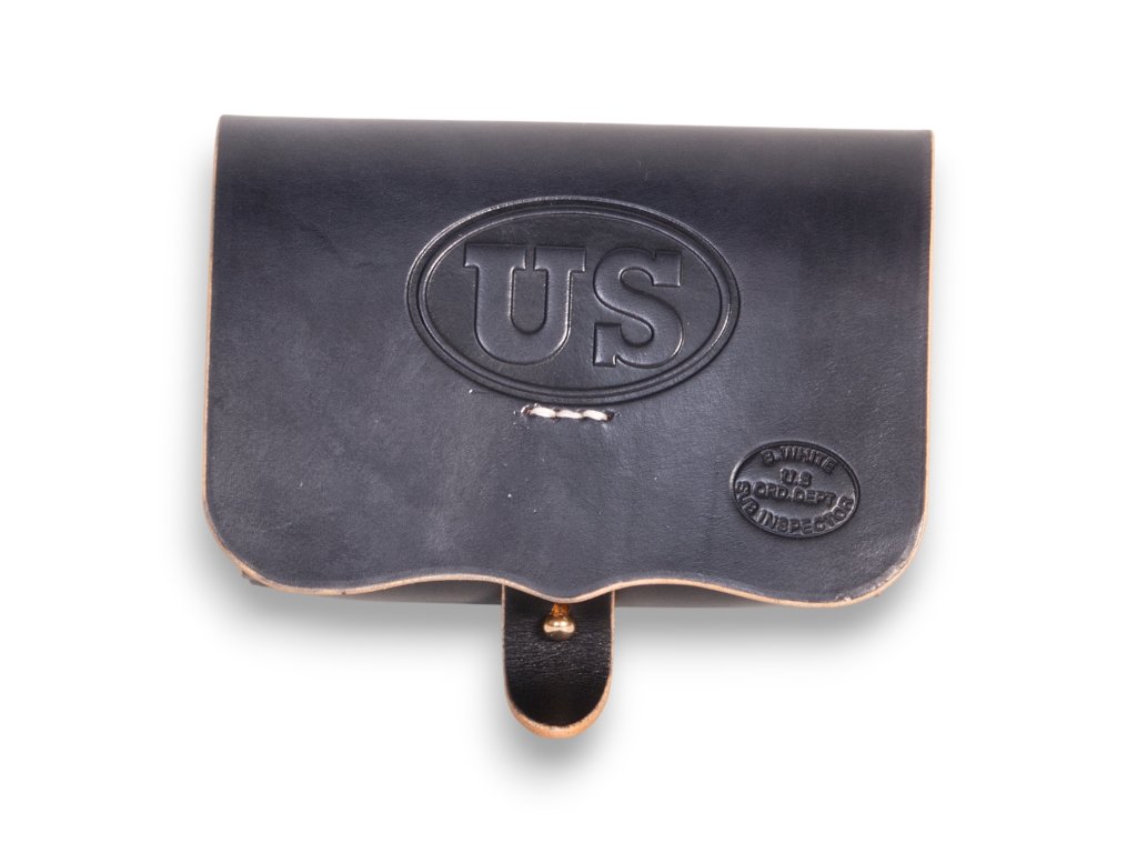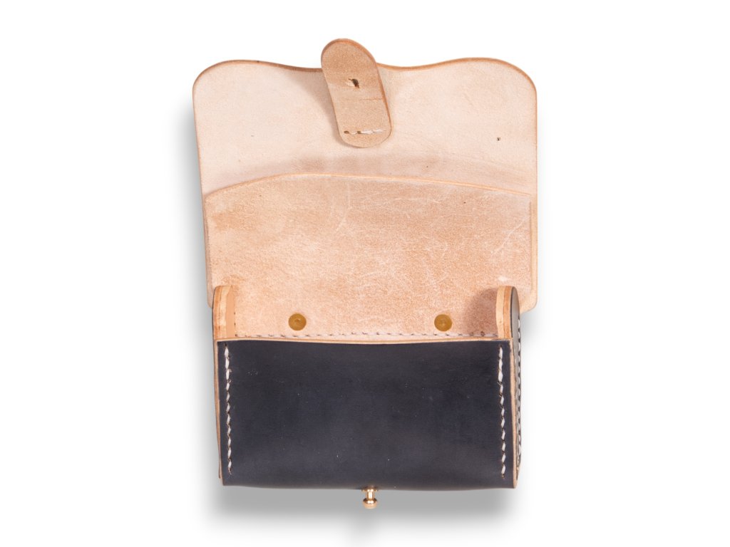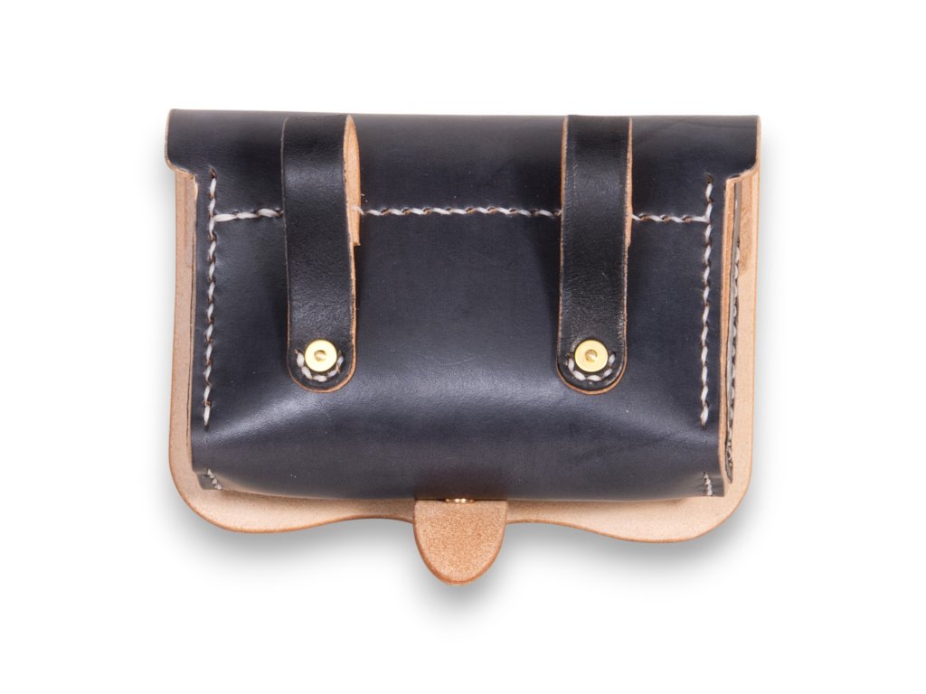 Třísločiněná hovězí hlazenice, barveno jednostranně jak bylo v 19. století běžné, ručně šito bílou voskovanou dratví. Zapínání na mosazný knoflík. Otisky raznic na přední straně brašničky na přání.